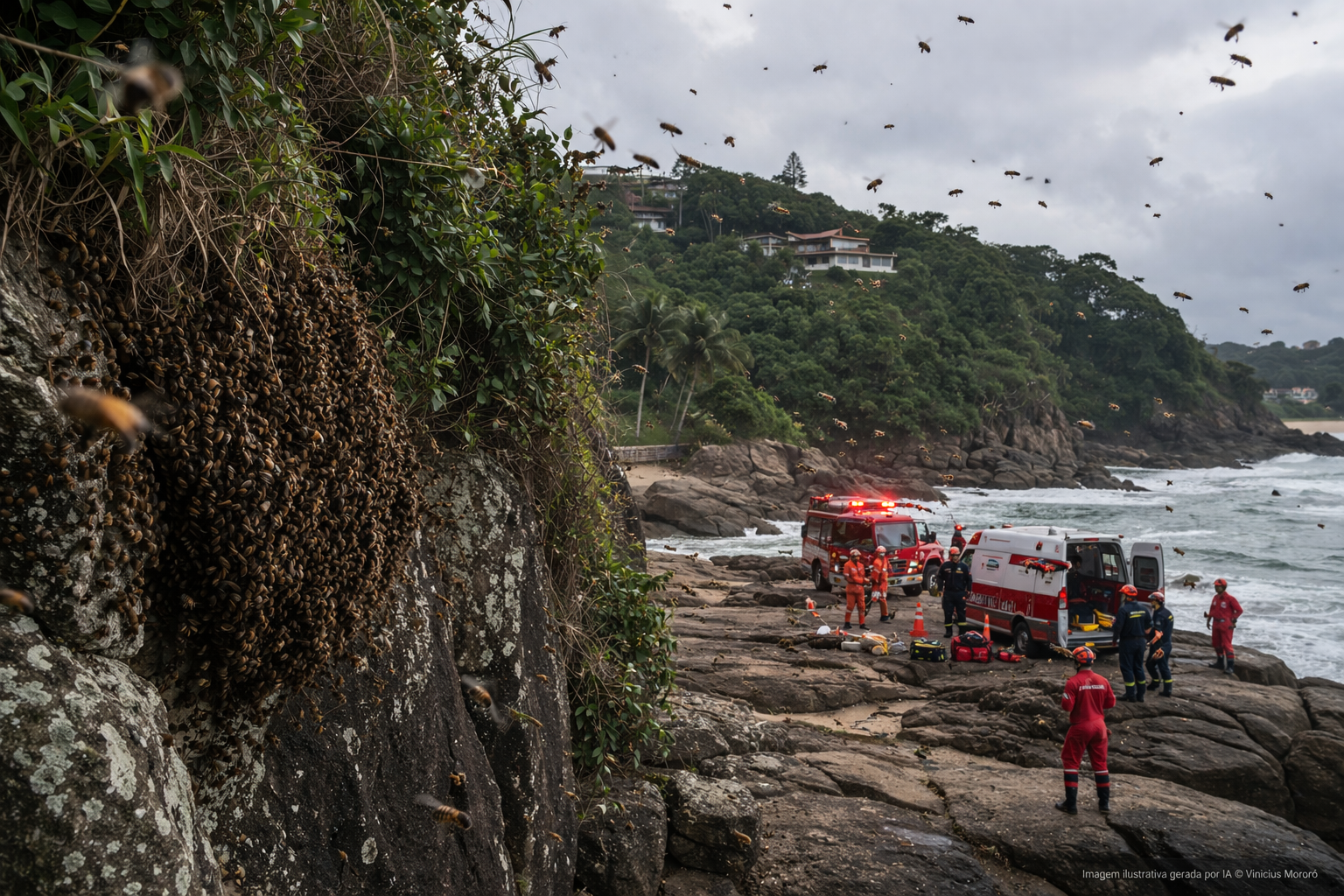 Um homem se jogou de um precipício de aproximadamente 90 metros de altura ao tentar escapar de um ataque de abelhas no litoral de São Paulo. O caso foi registrado na região de Santos, no Sudeste do país, e mobilizou equipes de resgate.
